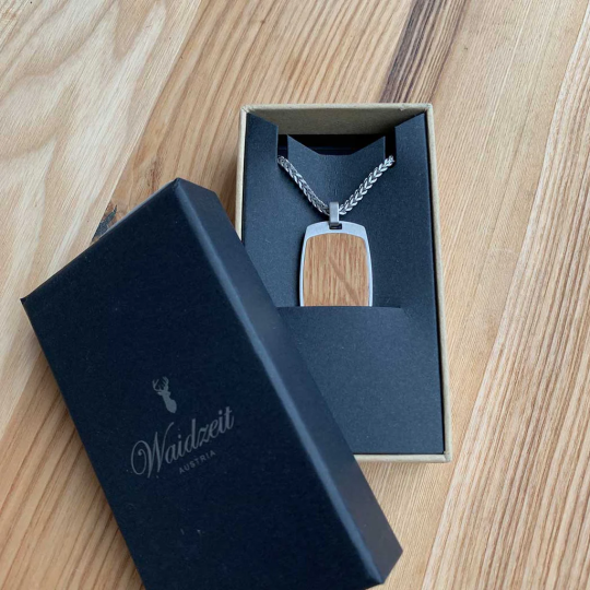 Halskette Männerkette Felix aus gebürstetem Edelstahl mit Einsatz aus heimischer Walnuss. Dezentes, geradliniges Design als zeitloses Statement‑Piece, das sich mit individueller Gravur personalisieren lässt. Kette in 60 cm Länge; Anhänger 22 × 40 mm mit markanter Holzstruktur für einen eleganten, modernen Look. Robuste Materialien, pflegeleicht und alltagstauglich. Plastikfreie Geschenkverpackung inkludiert – passend für Alltag und besondere Anlässe.