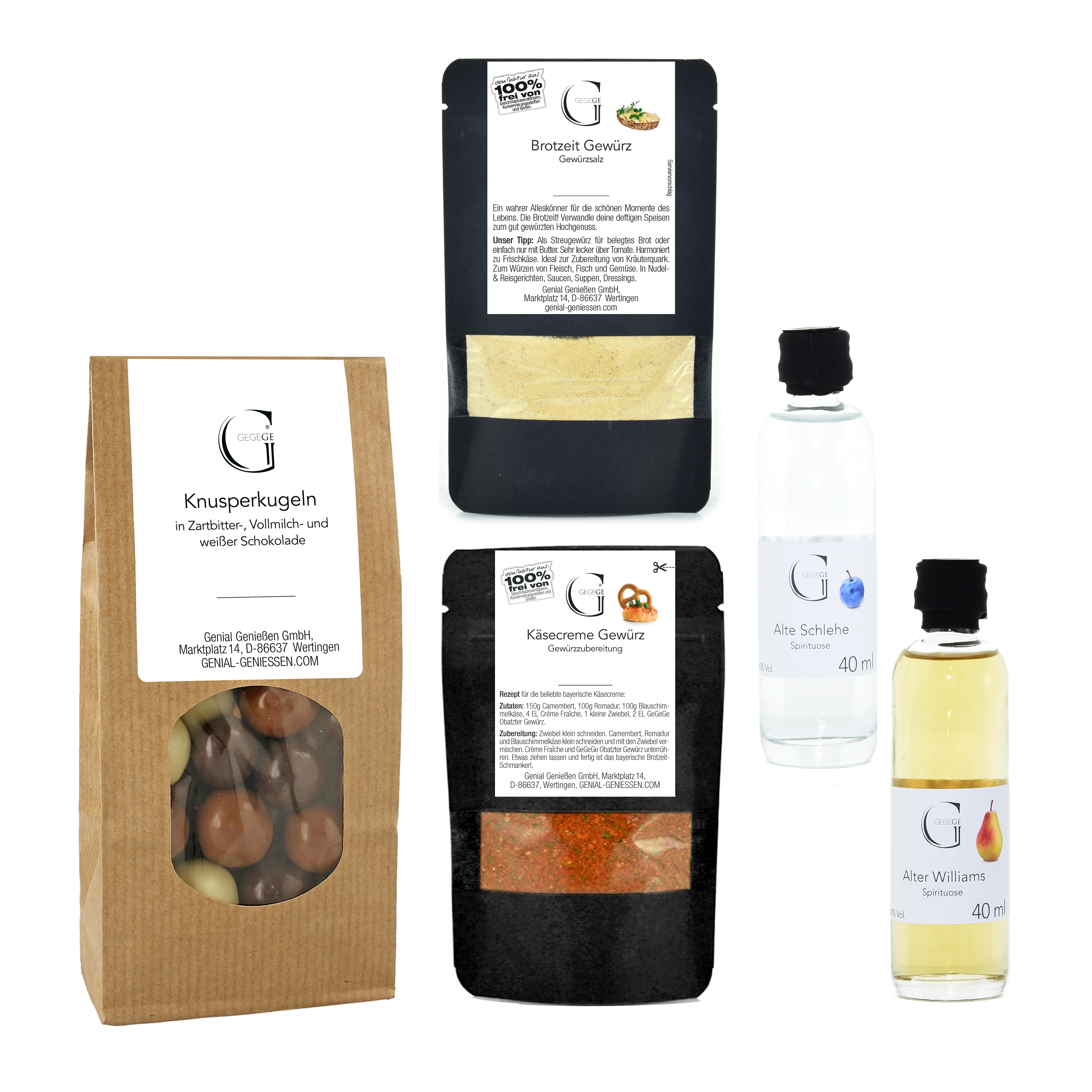 Das Hobby-Set „Handwerker“ enthält Brotzeit Gewürz S, Käsecreme Gewürz S, Knusperkugeln Mix (60 g), Alter Williams Schnaps (mini) sowie Alte Schlehe Schnaps (mini).
