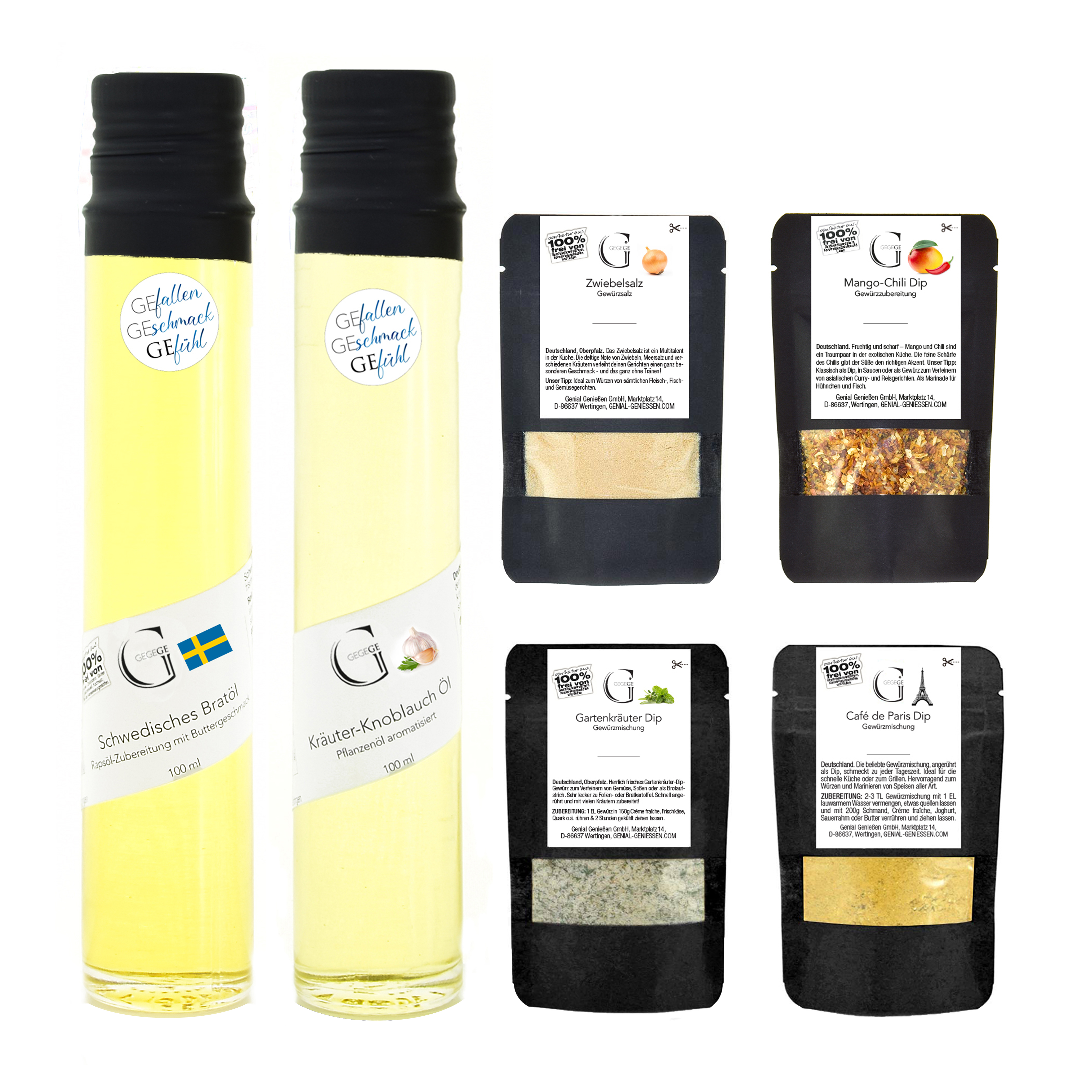 Die enthaltenen Produkte ermöglichen eine schnelle und kreative Zubereitung verschiedenster Gerichte. Würzige Dip-Gewürze eignen sich hervorragend als Brotaufstrich, zu Fingerfood oder als raffinierte Beilage beim Grillen. Das vielseitige Zwiebelsalz sorgt für eine kräftige Note bei Fleisch, Fisch oder Gemüse. Ergänzt wird das Set durch feine Öle: Das schwedische Bratöl dient als praktische Butteralternative, während das Kräuter-Knoblauch-Öl ideal zum Braten, Marinieren und Verfeinern ist.