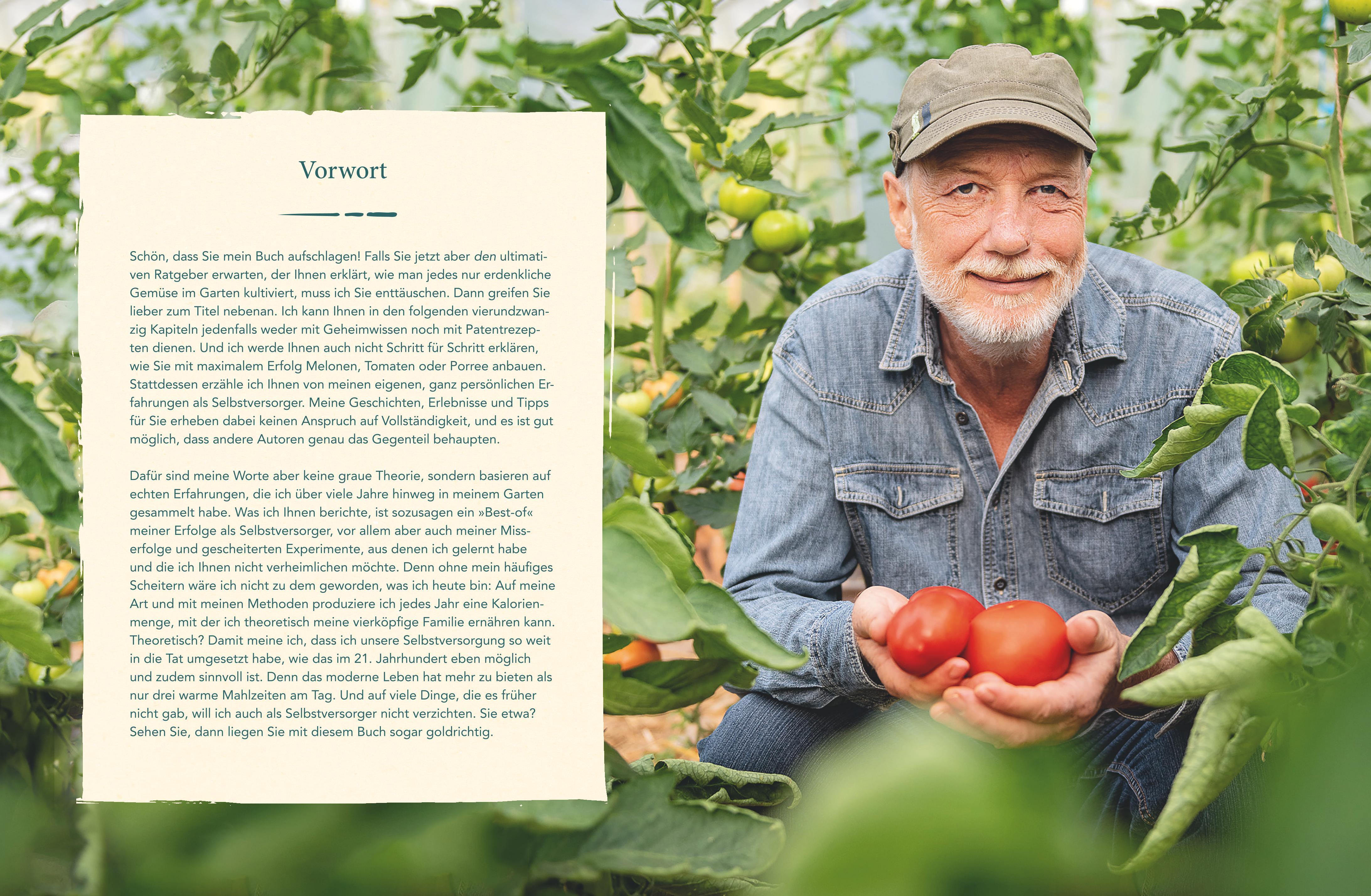 Hinweis zur OptimierungImpressumVorwortVon null auf Garten. Welcher Gartentyp sind Sie?Sag dem Supermarkt ade? Das ist für mich SelbstversorgungBlutiger Anfänger. Wie ich zum Gärtner wurdeDas wollen sie also auch? So geht SelbstversorgerAber bitte mit Sonne! Der neue GemüseackerEin kurzer Seitenblick nach unten. Der GartenbodenGärtners Gold. Mein KompostplatzNicht so nette Tierchen. Über SchädlingeMein Ständiger Begleiter. Was tun gegen Unkraut?Da ist doch was Faul! Mehltau & Co.Endlich Erde an den Fingern. Gemüse für AnfängerKleine Körnchen, Riesenthema! Saatgut – ein ExkursUnd ab damit in den Boden. Die DirektsaatErst mal in die Pötte kommen! Die VoranzuchtPflanzen haben Durst. Die BewässerungLieber nicht zu viel des Guten. Düngemittel im GartenDer Wald Als Vorbild. Mulchen, ein Allheilmittel?Kleine Trickkiste. Was bringen Hochbeete?Muskeln und Motorkraft. Meine wichtigsten GeräteBeste Freundinnen. Wie man Hühner hältMein Braten schnattert im Garten. Gänse und EntenGroße Schwärmerei. Bienen und HonigVon eigenen Ähren zehren. GetreideanbauMehr geht fast nicht. Trotzdem bin ich SelbstversorgerNachwortAdressen, die weiterhelfenBücher, die weiterhelfen