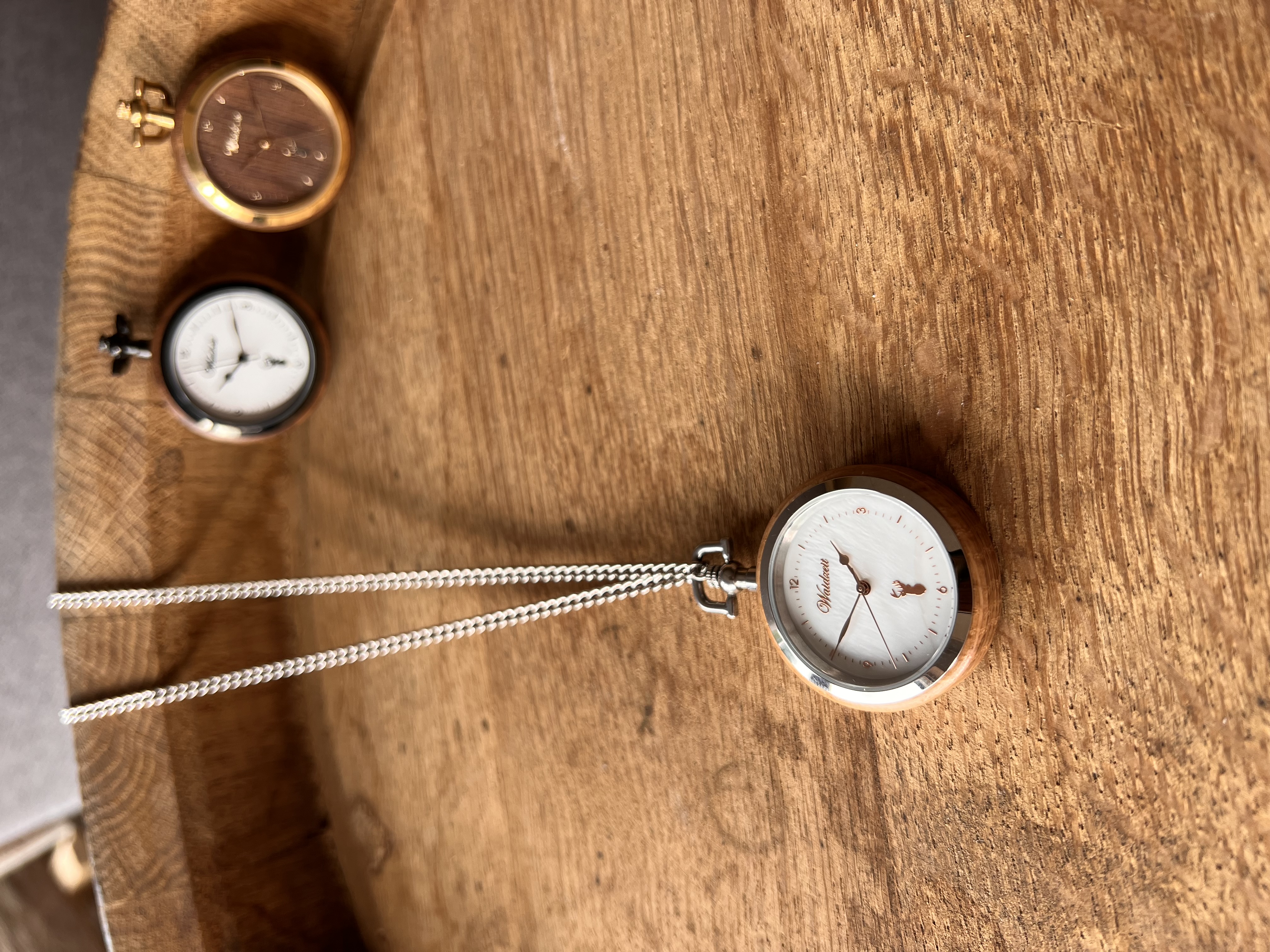 Taschenuhr Lune Perle mit Gehäuse aus Barrique‑Weinfassholz und schimmerndem Perlmutt‑Zifferblatt. Rosévergoldete Akzente sorgen für eine feminine Note; ein filigraner Hirsch ziert das Design. Zuverlässiges Miyota‑Uhrwerk, Edelstahlkrone und Kette, betriebsbereit mit Batterie. Eine feine, petite Damenuhr als stilvolles Accessoire und besondere Geschenkidee – hochwertig verarbeitet und geliefert in edler Holzschatulle.
