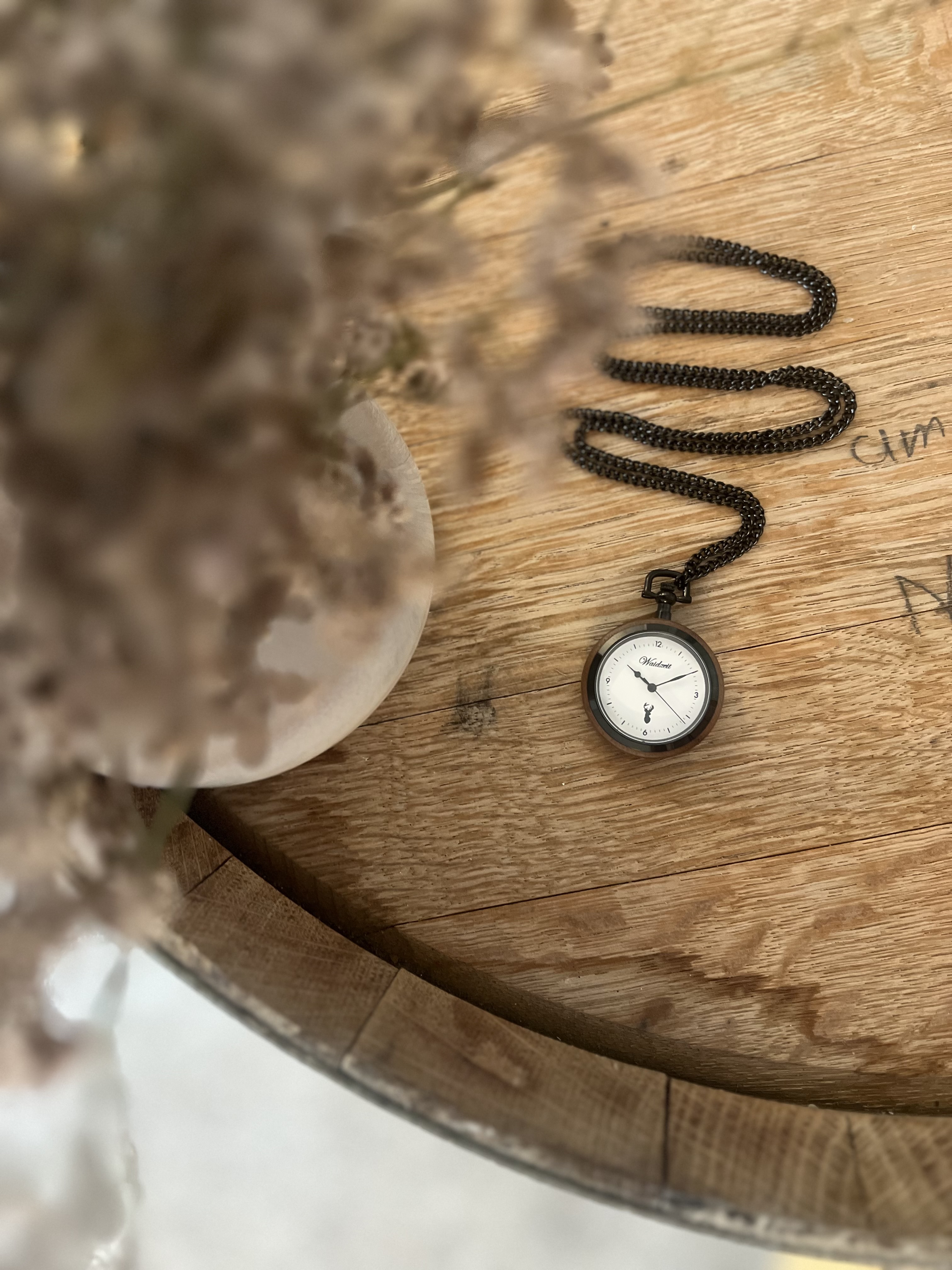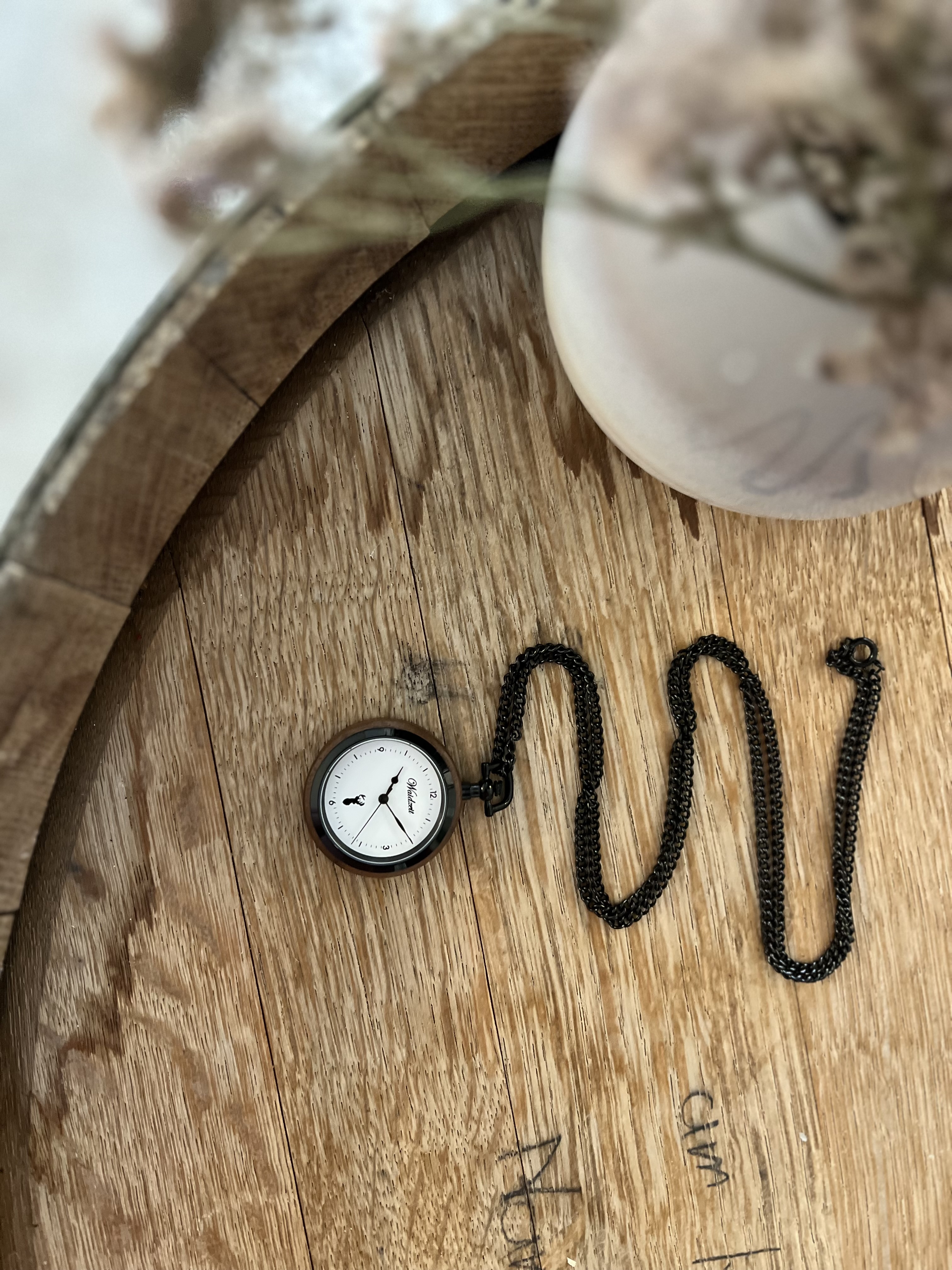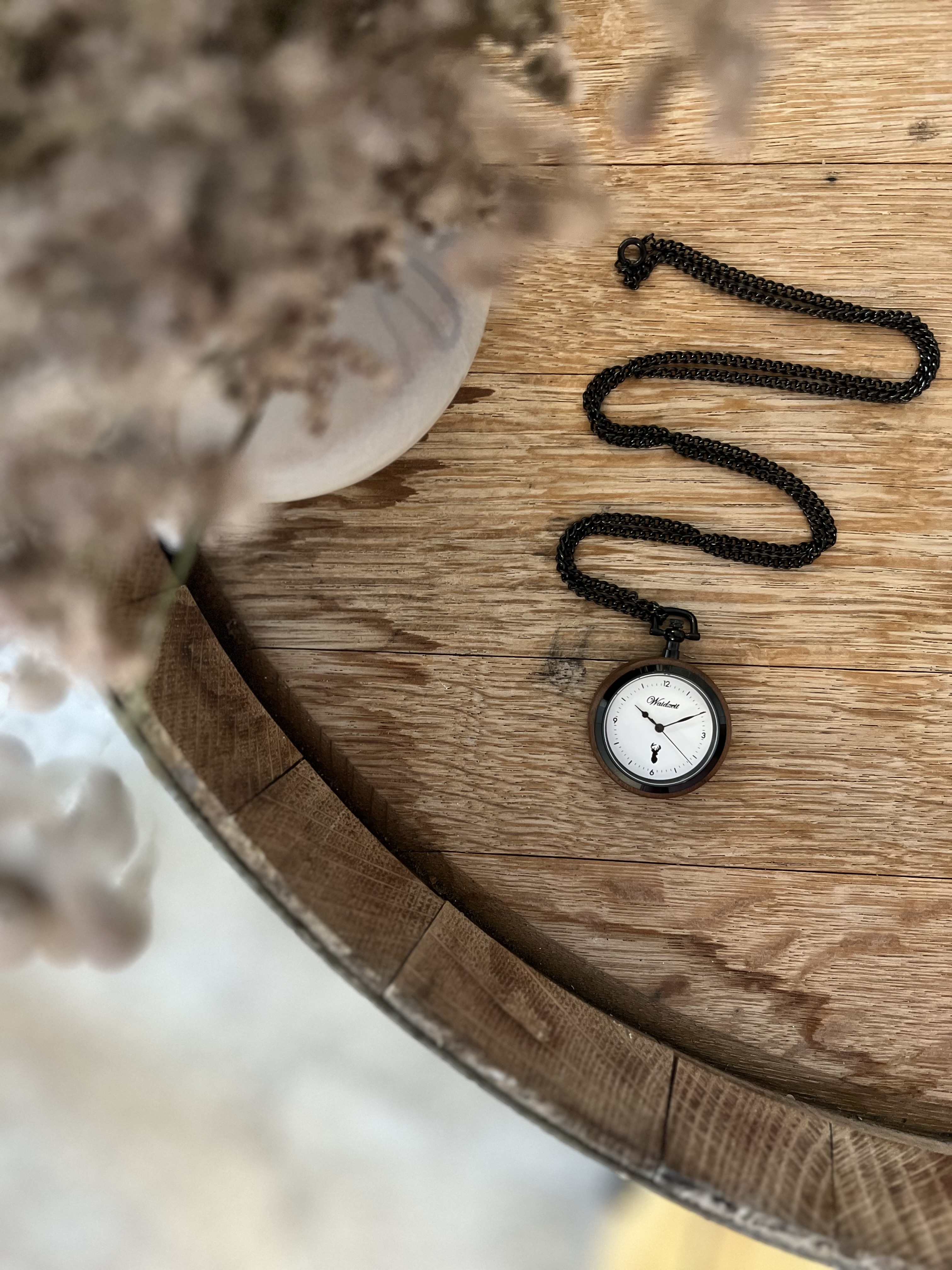 Taschenuhr Noir Elegance mit Gehäuse aus Walnuss und weißem Ziffernblatt für eine markant‑elegante Ausstrahlung. Der filigrane Hirsch setzt ein dezentes, naturverbundenes Highlight. Zuverlässiges Miyota‑Uhrwerk mit 2 Jahren Garantie, Edelstahlkrone und dunkel abgestimmter Kette, betriebsbereit mit Batterie. Geliefert in hochwertiger Holzschatulle – ein zeitloses Accessoire und besondere Geschenkidee.