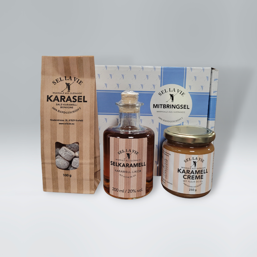 Diese kulinarische Geschenkbox von Sel la vie ist das perfekte Geschenk für alle Karamell-Liebhaber. Es vereint die süß-salzigen Karamell-Bonbons mit dem Karamell-Likör und der leckeren Karamellcreme.