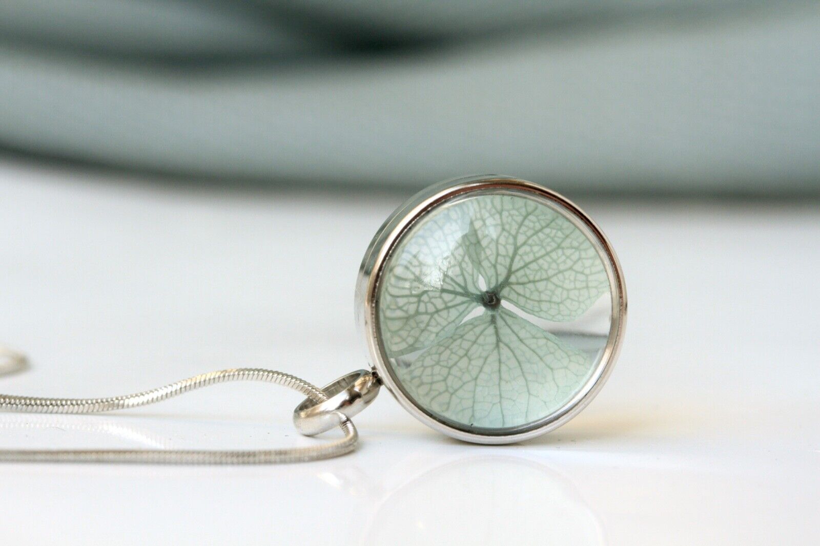 Ein kleines Stück Natur, eingefangen in einem zarten Medaillon: Eine gepresste blaugrüne Hortensienblüte liegt sicher geschützt hinter einem gewölbten Glasfenster, eingefasst in Edelstahl und kombiniert mit einer eleganten Schlangenkette. Die gewölbte Glasform erzeugt einen sanften Vergrößerungseffekt, der die zarte Blüte besonders hervorhebt.