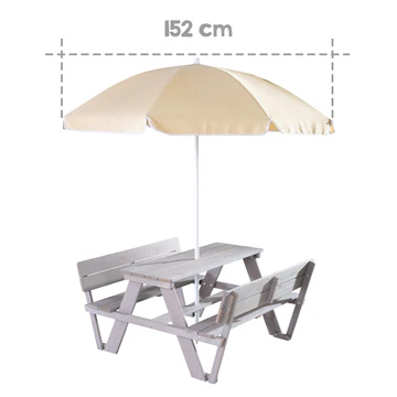 Mit abgerundeten Ecken, stabiler Konstruktion und kippsicherem Design sorgt sie für Sicherheit beim Spielen, Malen und Picknicken. Der integrierte Sonnenschirm lässt sich leicht befestigen und spendet angenehmen Schatten. Pflegeleicht, schadstoffgeprüft und nachhaltig produziert – ideal für Garten, Terrasse oder Innenbereiche.