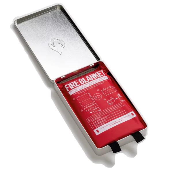 Diese hochwertige Löschdecke, präsentiert in einer stilvollen Metallbox, ergänzt die Design-Feuerlöscher von Nordic Flame perfekt und verbessert den Brandschutz in jedem Haushalt.