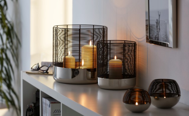 Das Windlicht LUNA vereint hochglanzpoliertes Nickel als edle Basis mit einer Haube aus pulverbeschichtetem Stahldraht. Der moderne Materialmix unterstreicht den hohen Designanspruch und erzeugt zugleich stimmungsvolle Lichteffekte.