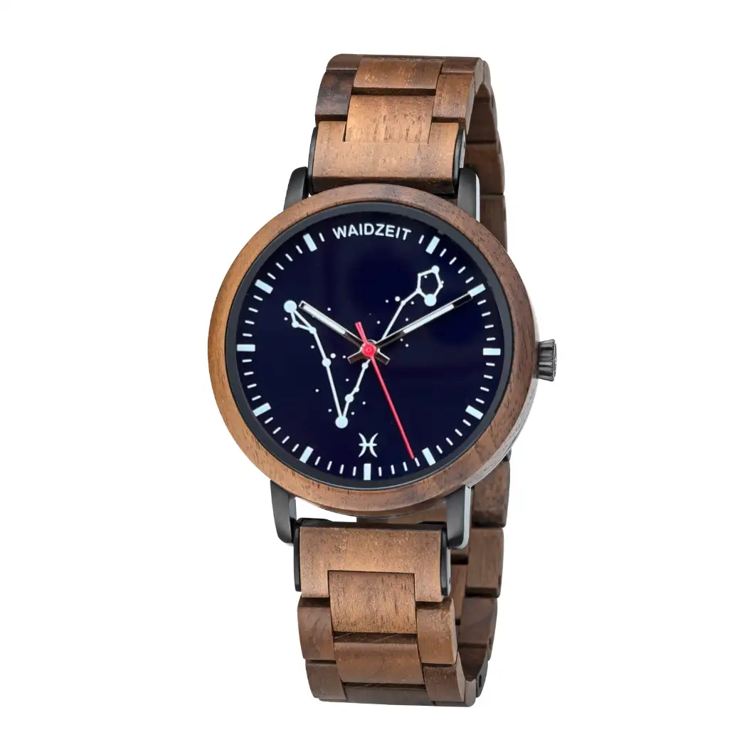 Die Sternzeichenuhr von Waidzeit verbindet ausdrucksstarkes Design mit natürlicher Eleganz. Gefertigt aus edlem Walnussholz, überzeugt sie durch ihr fein verarbeitetes Holzarmband und ein stilvolles Echtholz-Ziffernblatt mit eingraviertem Sternbild. Jedes Modell steht für eines der zwölf Tierkreiszeichen – und wird so zu einem ganz persönlichen Unikat.