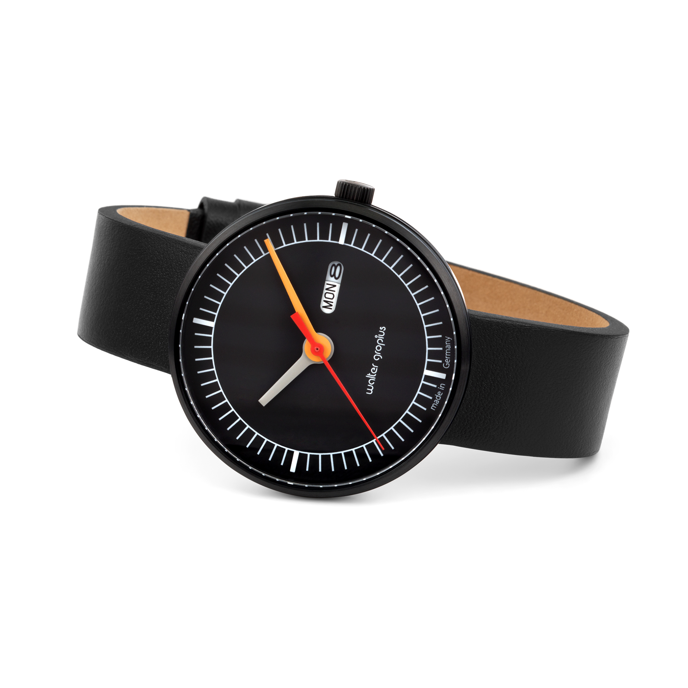 Die Walter Gropius Classic Date Uhr verbindet minimalistisches Design mit funktionaler Eleganz und verkörpert den Bauhaus-Stil. Das tiefschwarze Ziffernblatt bietet einen klaren Kontrast zu den schlichten weißen Stundenmarkierungen und den Zeigern in den klassischen Primärfarben Rot, Gelb und Orange, was für eine ausgezeichnete Ablesbarkeit sorgt und der Uhr einen modernen, dynamischen Look verleiht. Die praktische Datumsanzeige ermöglicht eine schnelle Übersicht über Tag und Datum.