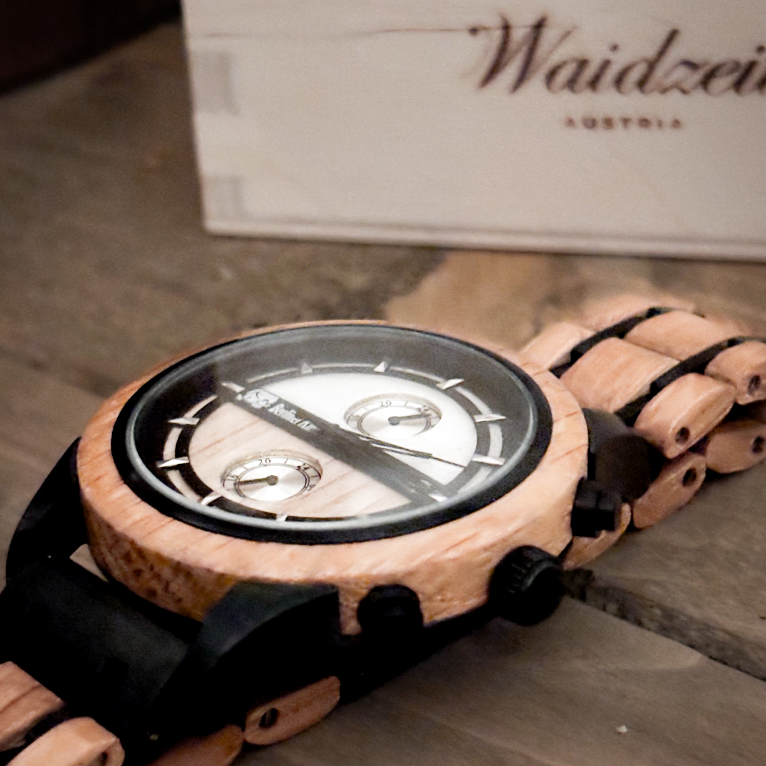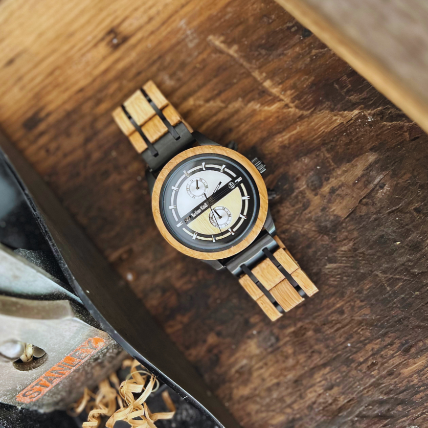 Das robuste Holzarmband der Uhr ist mit schwarzen Edelstahlelementen verstärkt, die den zeitlosen Stil perfekt abrunden. Dank des mitgelieferten Uhrmacherwerkzeugs lässt sich das Armband mühelos an jede Handgelenkgröße anpassen, sodass Tragekomfort und Passform individuell gestaltet werden können.