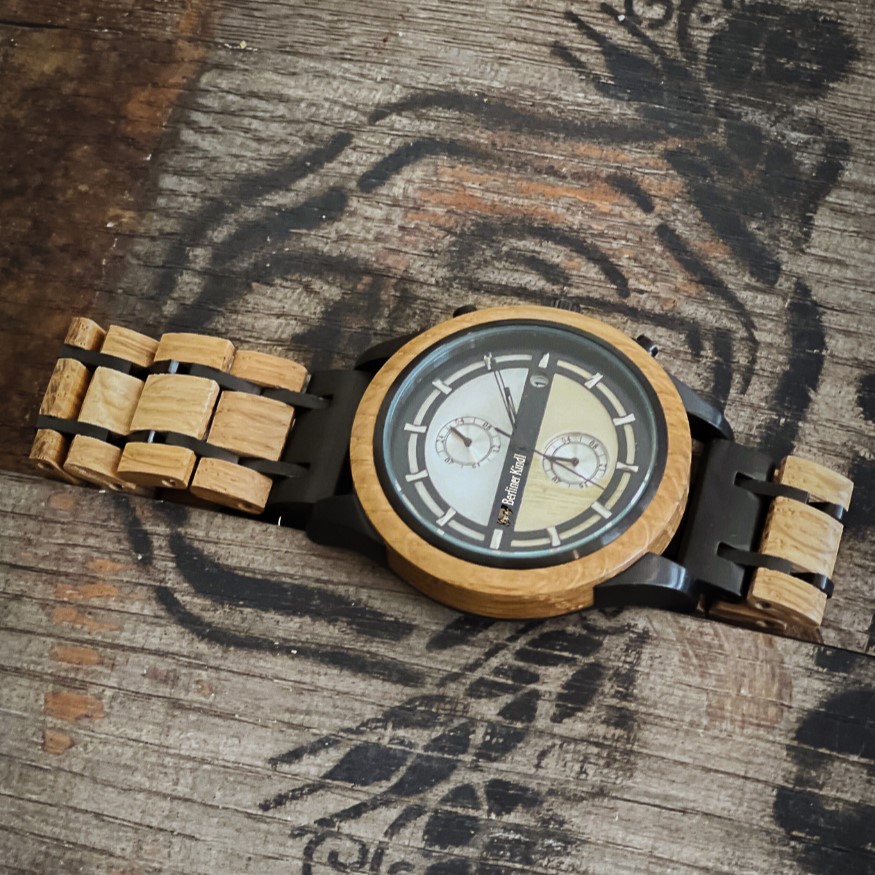 Die Armbanduhr Berliner Kindl aus recyceltem Eichenholz eines Bierfasses der traditionsreichen Berliner Kindl Brauerei ist ein edler und umweltbewusster Zeitmesser. Jede Uhr erzählt die Geschichte einer jahrzehntelangen Brautradition und steht für die Verschmelzung von Nachhaltigkeit und Eleganz.