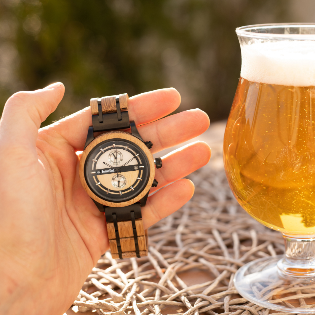 Die Berliner Kindl Uhr ist weit mehr als nur ein Zeitmesser – sie verkörpert die einzigartige Verbindung von Berliner Braukunst, Handwerkskunst und modernem Design. Hergestellt aus recyceltem Eichenholz originaler Bierfässer der traditionsreichen Berliner Kindl Brauerei, steht diese Uhr für ein nachhaltiges Produkt mit einer faszinierenden Geschichte. Jedes Detail dieser limitierten Armbanduhr erzählt von der Leidenschaft und Hingabe, mit der sie gefertigt wurde.