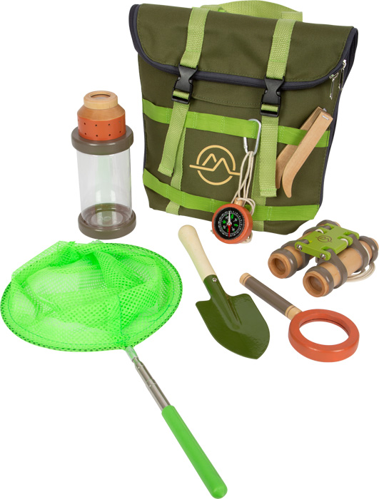 Im Rucksack findet das komplette Forscher-Equipment Platz: verschraubbares Insektenglas mit integrierter Lupe, Holzfernglas, Schmetterlingsnetz/Kescher mit Teleskoparm, Kompass mit Trageband, Lupe mit Vergrößerungsfunktion sowie Pinzette, Schaufel und Karabiner. Praktisch: Das extra große Rucksackfach hat einen weit zu öffnenden, durchgehenden Reißverschluss, größenverstellbare Schulterriemen und viele Befestigungsschlaufen.