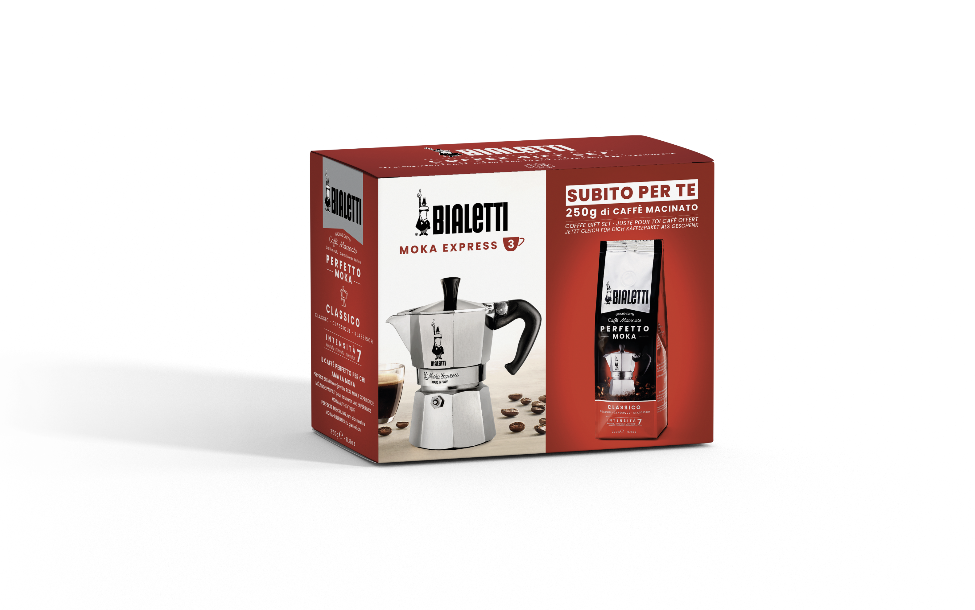 Der meistverkaufte Espressokocher von Bialetti mit über 300 Millionen verkauften Stück inkl. 3 oder 6 Tassen und 250 gr Perfetto Moka Classico Kaffee, gemahlen 250gr.