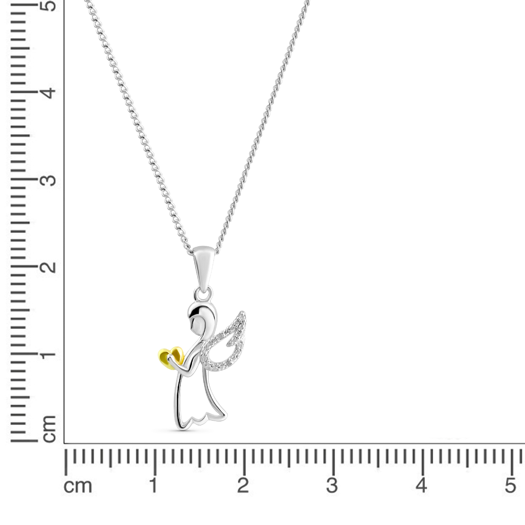 Die Kette mit Anhänger - Engel besteht aus hochwertigem 925 Sterling Silber, das für seine Langlebigkeit und Beständigkeit bekannt ist. Der Anhänger ist rhodiniert und das kleine Herz, welches der Engel hält, ist vergoldet, was ihm ein elegantes und zeitloses Aussehen verleiht. Die Kombination aus den beiden Farben macht den Anhänger zu einem echten Blickfang.