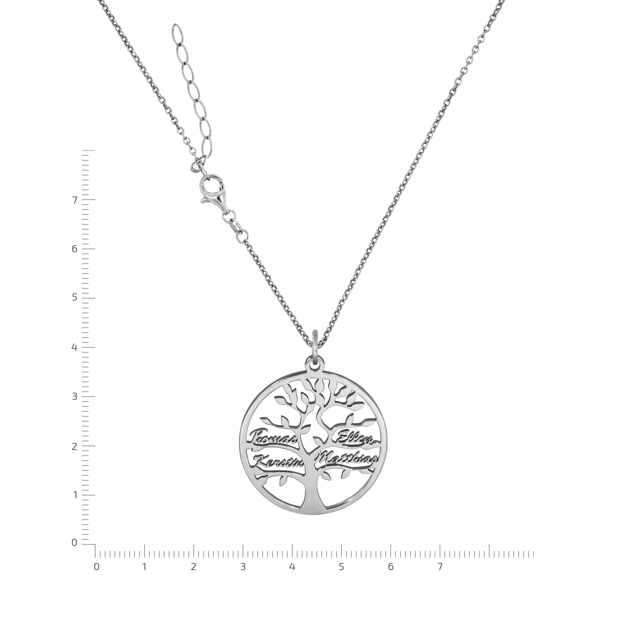 Die Kette besteht aus einem zarten Silberanhänger, der mit einem filigranen Baum und ausgewählten Namen versehen ist. Es können bis zu 8 Namen eingefügt werden.