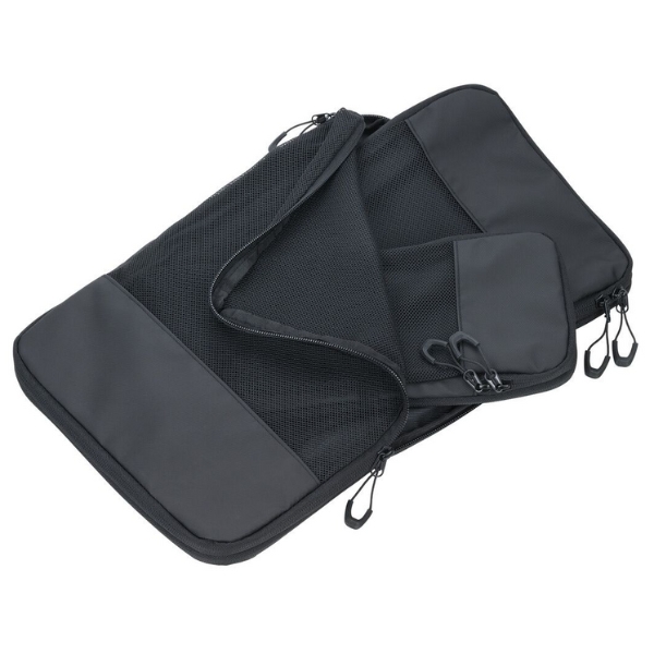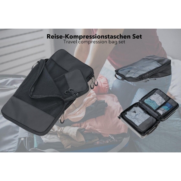 Die perfekte Lösung für strukturiertes und platzsparendes Packen mit unseren Reise-Kompressionstaschen-Set (3er-Set) in elegantem Schwarz. Diese praktischen Packing Cubes lassen sich mühelos in Ihrem Koffer oder Rucksack verstauen und bieten Ihnen die Möglichkeit, Kleidung ordentlich und übersichtlich zu organisieren.