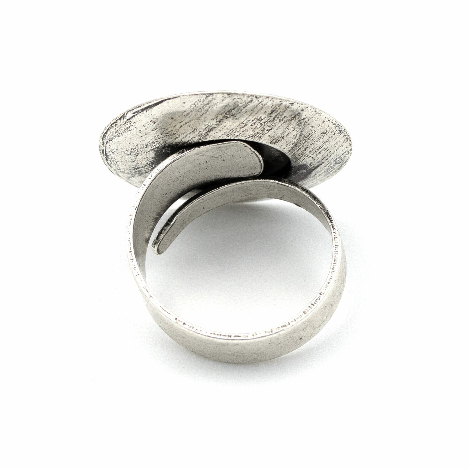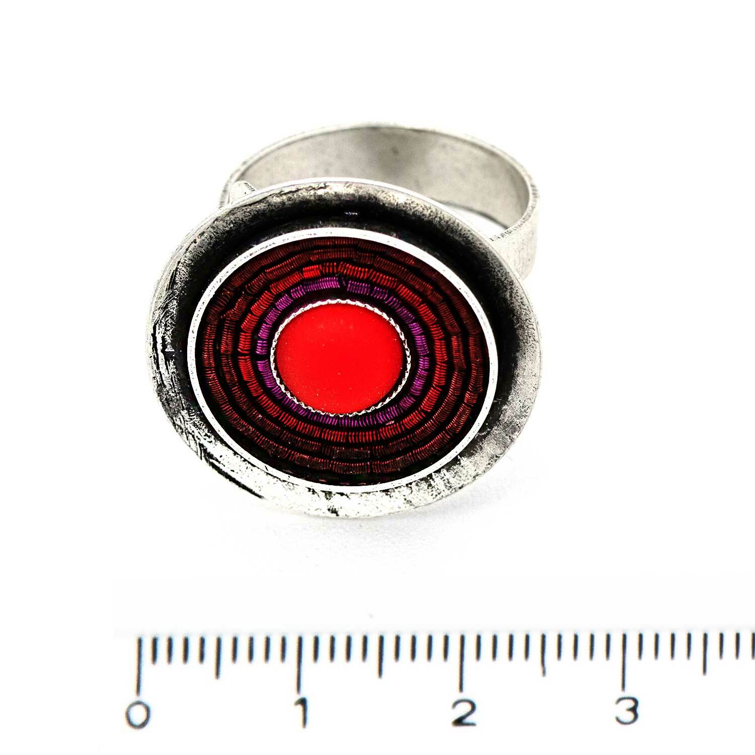 Größenverstellbarer Ring, verziert mit eloxiertem Spiraldraht und Glascabouchon in leuchtendem Rot.