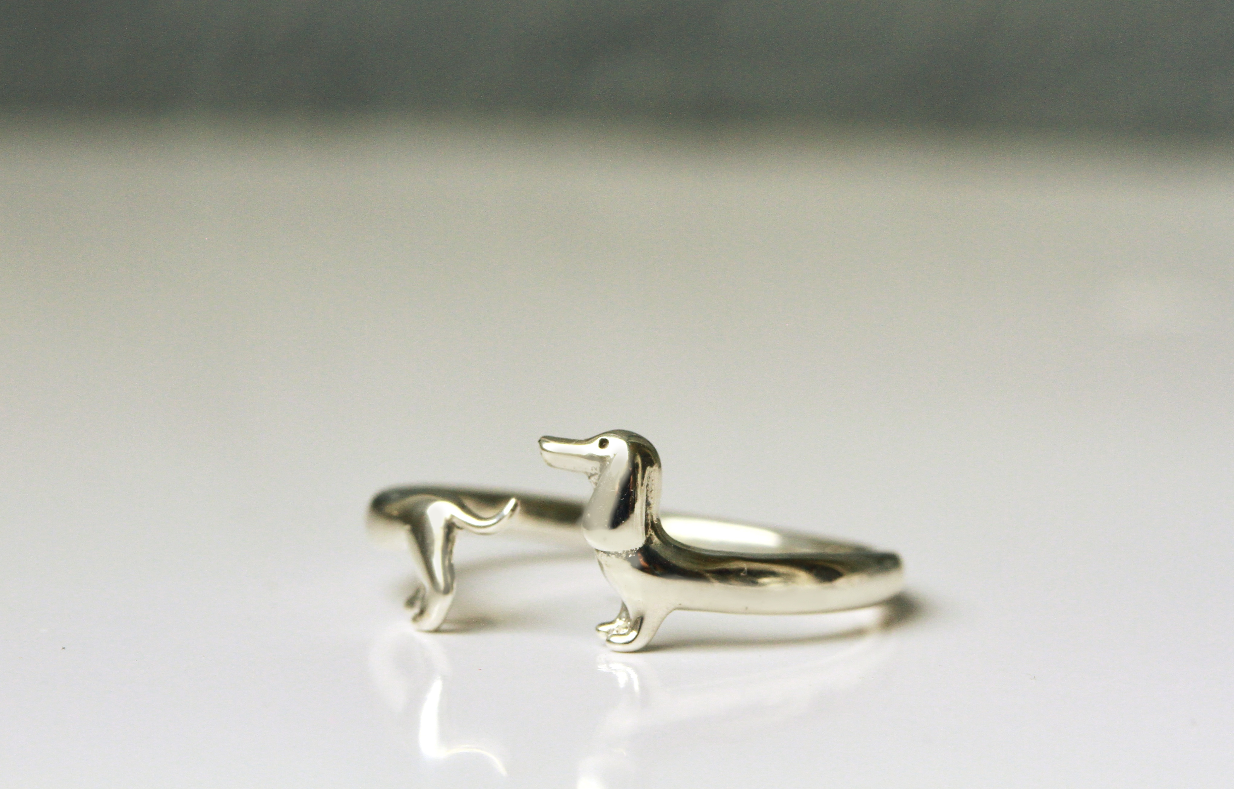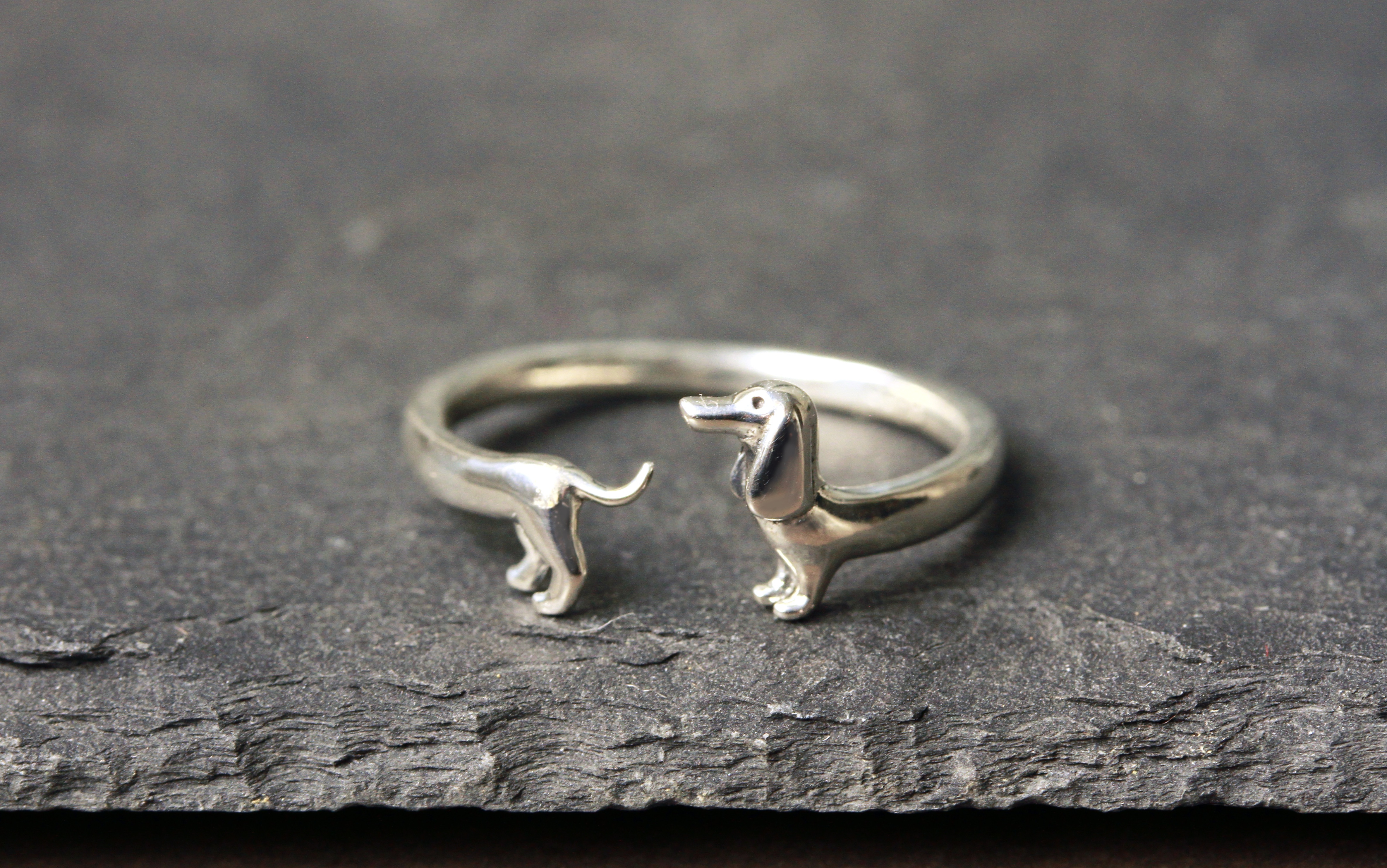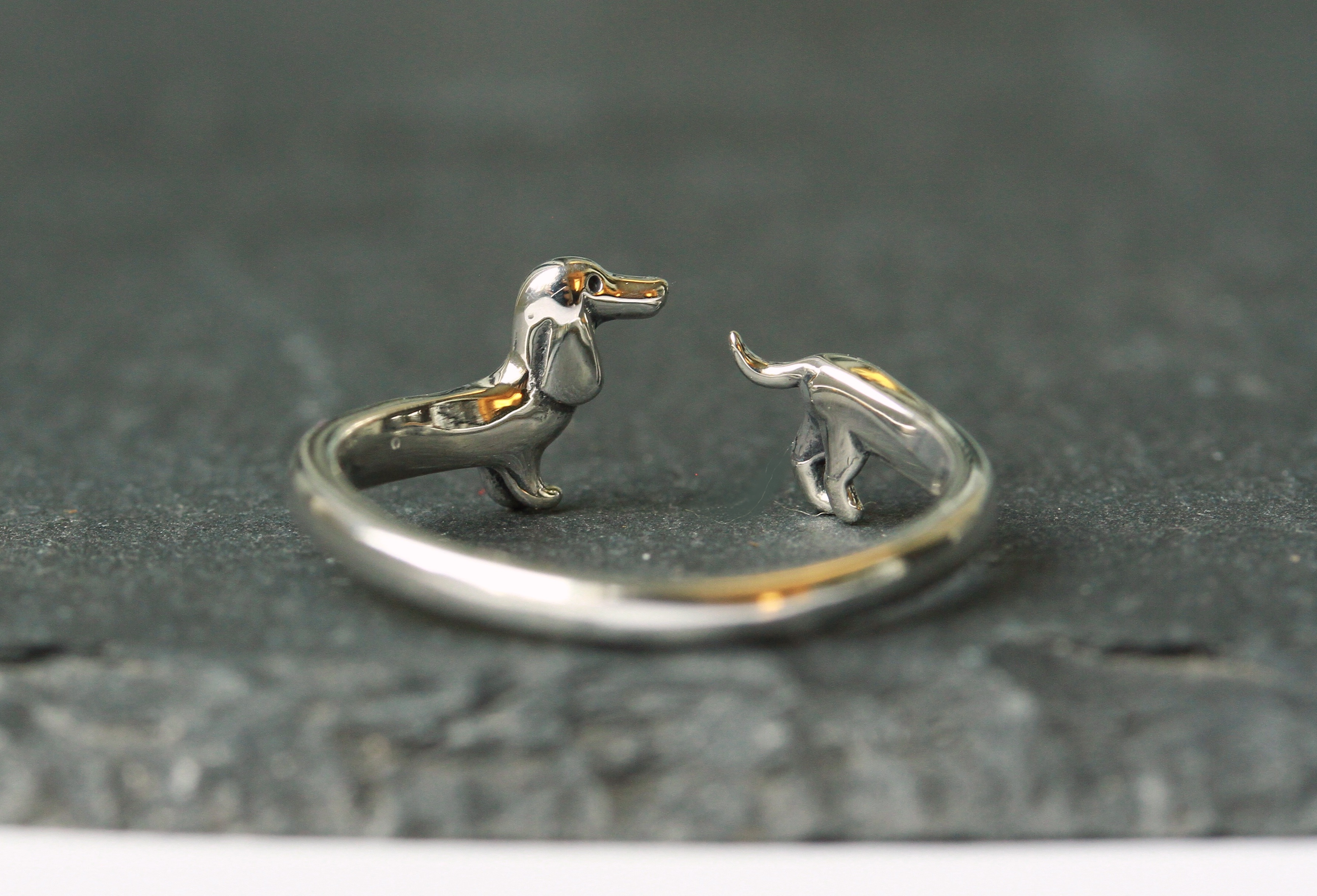 Ein fein ausgearbeiteter Ring aus Sterling Silber (925) mit einem kleinen, dreidimensionalen Dackel. Das Auge wurde durch Oxidation geschwärzt.