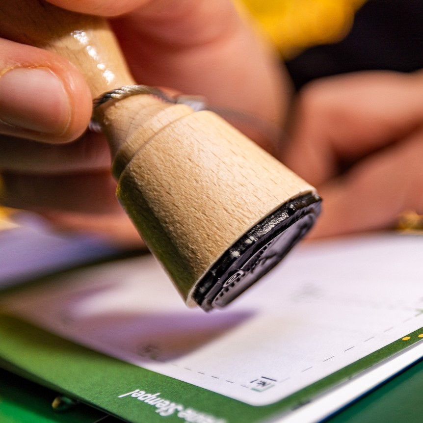 Sobald die Wanderer eine dieser Stempelstellen erreicht, stempeln sie die Stelle in ihrem Heft ab, um zu dokumentieren, dass sie diesen Punkt passiert haben.